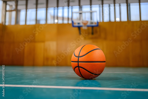 Basketball on Court with Hoop in the Background Sports Competition, Athletic Game, Team Activity and Arena Venue