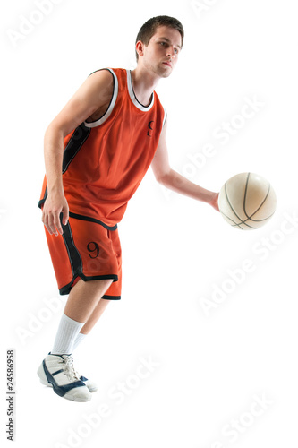 sport, basketball, player, ball, sportsman, action, activity, athlete, dripped, dribbling, athletic, competition, cut, exercise, game, isolated, motion, out, play, professional, studio, t-shirt, team, training, white, young