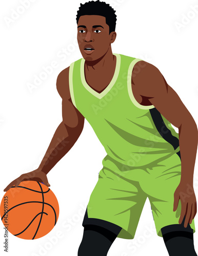 basketball, player, activewear, green, dribbling, ball, orange, athlete, uniform, game, sport, competition, action, male, youth, fitness, exercise, recreation, teamwork, skill, energy, dynamic, active, movement, training, court, vector, illustration, athletic, sports equipment, basketball court, dripped