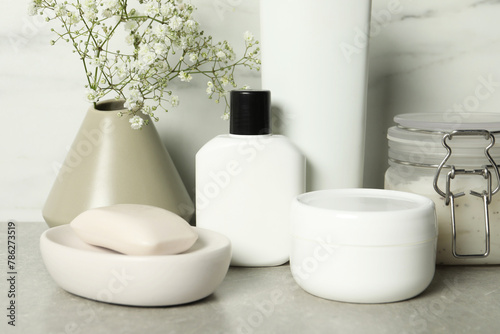 Bath accessories. Personal care products and gypsophila flowers in vase on gray table, closeup