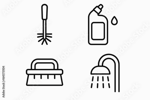 Bathroom cleaning icons set – hygiene products, household chores, sanitation tools, simple line style