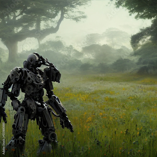 generative, ai, machine, spent, old, battle, damage, rust-eaten, landscape, abandoned, cinematic, sombre, lighting, scrap, metal, military, large, biped, alien, ominous