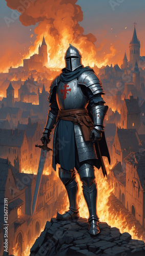 Battle-hardened medieval knight in full armor standing triumphantly as flames engulf a medieval city in the background