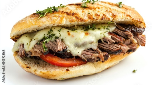 Bauru sandwich with roast beef, tomato, melted cheese in French bread, isolated white background