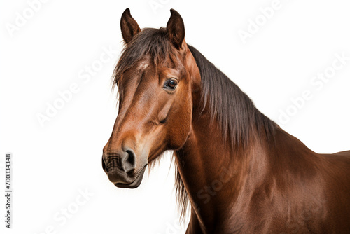 Bay Holsteiner Horse close-up portrait on a white background.