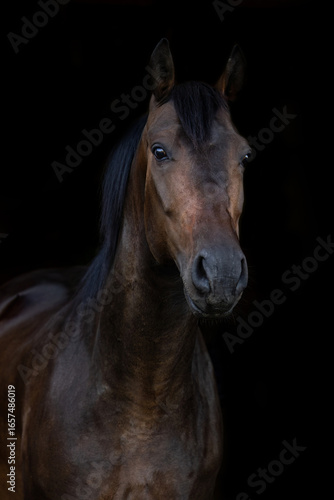 black background, athletic, attentive, bay, dressage, beautiful, breed, brown, countryside, elegant, equestrian, equine, field, gelding, grass, head, head shot, horse, looking, majestic, portrait, posing, purebred, rural, standing, summer, warmblood, black