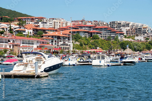 Bay ,Marina, motor boats and boats on the black sea in Bulgaria in the resort a Beautiful view of the mountains hotels
