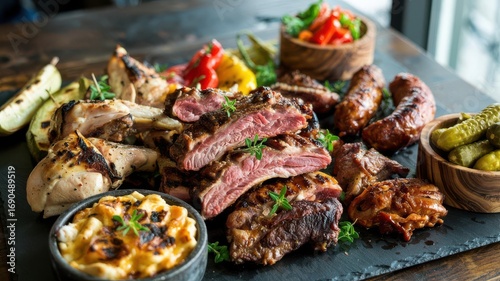 bar-b-q, platter, bar-b-q, grill, grilled, steak, beef, ribeye, sausage, sausage, chicken, meat, meat, vegetable, pepper, bell pepper, corn, macaroni, cheese, pickle, pickled, slate, board, herb, garnish, charred, roasted, gold, creamy, assorted, arrangement, grilling, cooking, food, dining, meal, delicious, tasty, juicy, tender, smoky, rustic, presentation, plating, culinary