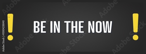 Be in the now. A blackboard with white text. Illustration with grunge text style.