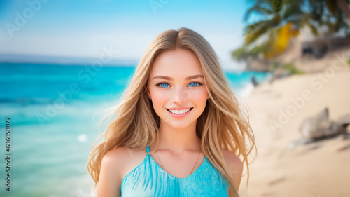 Beach Beauty: Radiant Blue-Eyed Teen Girl with an Irresistibly Cute and Attractive Smile - Perfect Portrait for Admirers