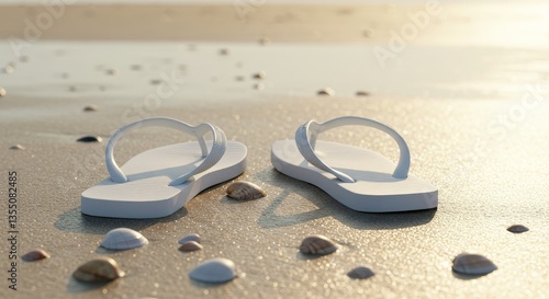 Beach Flip Flops and Seashells - Pair of white flip flops on sandy beach with seashells, summer vacation concept