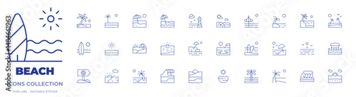 Beach icons collection. Thin Line icons, editable stroke. surfboard, sea, waves, sunset, beach, rocky