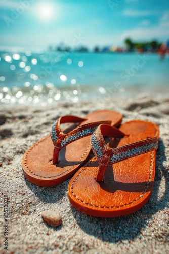 sandal, beach, summer, relaxation, ocean, sea, water, shore, coast, vacation, travel, sunshine, warm, clear, blue, sky, day, bright, horizon, sand, holiday, footwear, flip-flop, leather, brown, tan, simple, still life, nature, scenic, seascape, coastal, tranquil, calm, serene, peaceful, turquoise, sunny, light, warmth, escape, freedom, rest, quiet, dune, gold
