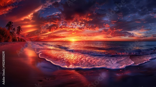 Beach Sunset, vibrant colors, serene environment, wide shot, inviting