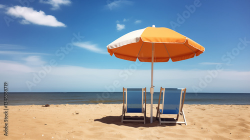 Beach umbrella with chairs on the sand, In the background, blue sky with sunny day, Text space for summer poster.