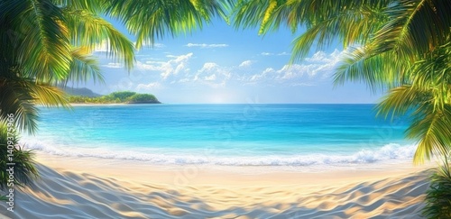 Beach Vacation Relaxing on Tropical Sand with Paradise Island and Palm Leaves