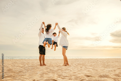 Beachside celebration as an Asian family with father and mother holding children jumps joyfully into air. beautiful ocean background captures essence of family happiness and carefree fun.