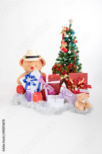 Bear doll with boxs gifts and christmas tree on white background in christmas festival