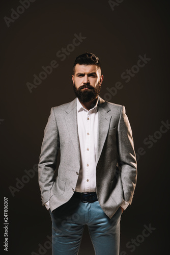 beard businessman posing in gray jacket isolated on brown