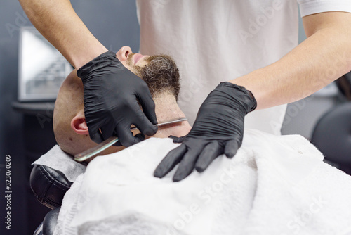 beard modeling in Barber shop, beard care for men, male beauty and care concept, shaving with a straight razor