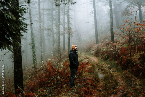 man, forest, rain, coat, pensive, fir, tree, hat, cold, weather, water, dripped, rainy, bearded, thoughtful, wood, thinking, guy, young, countryside, walking, park, nature, confident, lifestyle, hiking, male, serious, needle, coniferous, outdoors, horizontal, blurred background, copy space, looking away, half face, fog