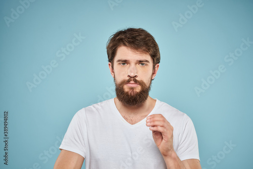 Bearded man emotions white t-shirt lifestyle gestures with hands blue backgrounds