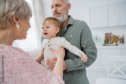 bearded man holding toddler granddaughter near blurred wife in kitchen.