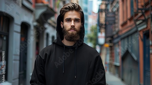 Bearded Man in a Black Hoodie Standing in an Urban Alleyway