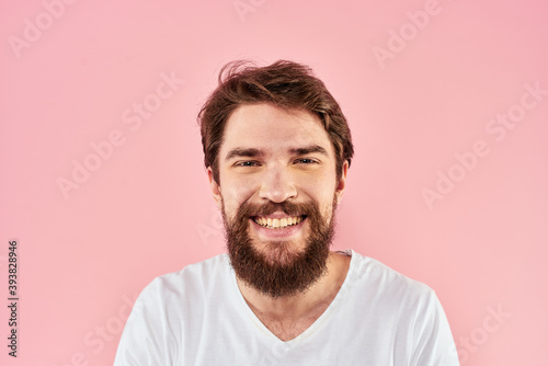 Bearded man in white t-shirt gesturing with hands facial expression close up pink background