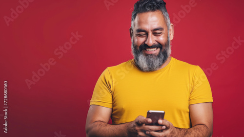 man, phone, laughing, red, background, yellow, shirt, beard, joy, mature, technology, smartphone, communication, happy, adult, stylish, wireless, casual attire, cheerful, modern, social, media, texting, connectivity, male, portrait, senior, happiness, lifestyle, device, user, clothing, fashion, enjoyment, holding, mobile, humor, fun, vibrant, trendy, browsing, entertainment, positive, digital, attractive, leisure, looking, down, facial