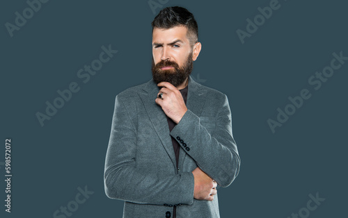 bearded pondering man wear casual on grey background
