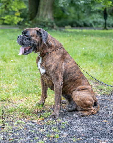 beautiful 3 years old purebred golden brown german boxer dog puppy jumping playing outdoor shooting