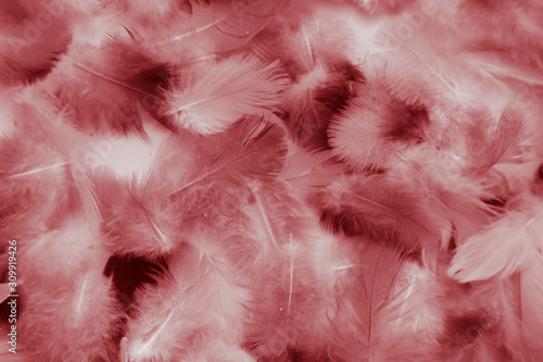 Beautiful abstract colorful white and red feathers on black background and soft white pink feather texture on white pattern