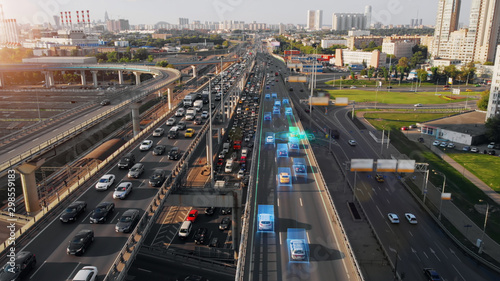 Beautiful aerial presentation of the autonomous cars self-driving concept on multi-level highway in Moscow. Picturesque aerial panorama of the road traffic in a big city on the evening.