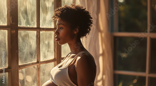 beautiful, african american, pregnant woman, standing, home, maternity, pregnancy, expecting, indoor, motherhood, mother-to-be, antenatal, family, expectant mother, anticipating, motherly love, homecoming