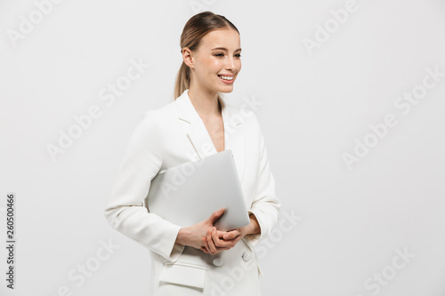 Beautiful amazing woman posing isolated over white wall background holding laptop computer.