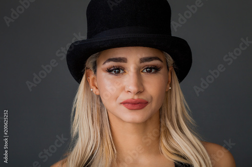 Beautiful and lovely woman portrait wearing top hat and looking at camera