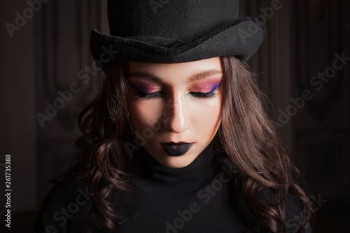 girl, hat, black, lip, hatter, halloween, mysticism, make-up, riddle, mysterious, woman, fashion, model, beautiful, portrait, beauty, face, female, glamour, vintage, style, lady, posing, people, art, lipstick, retro, attractive, woman, gothic, subculture