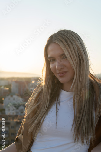 Beautiful and young blonde woman portrait on a rooftop at sunset