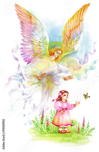 Beautiful Angel with Wings Flying over Child, Watercolor Illustration.