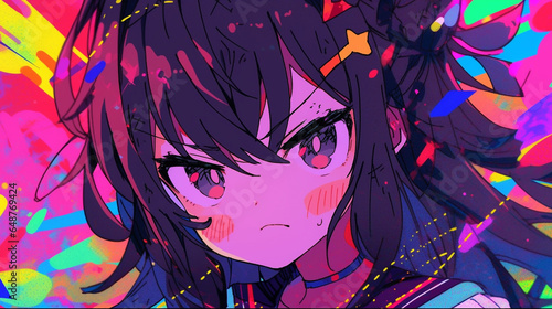 Beautiful anime girl angry expression, cyberpunk school uniform, psychedelic background