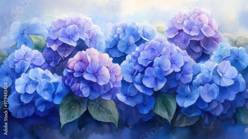 Beautiful arrangement of purple and blue hydrangeas in soft focus, perfect for floral designs and nature themes.