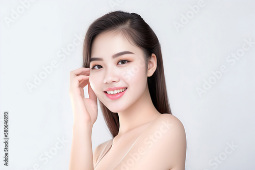 Beautiful Asian Woman, Close up on her face with Smooth skin look at the camera on a White background in Studio light. generative AI