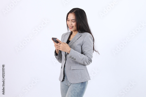woman, smiling, holding, mobile phone, phone, wearing, grey, blue, mobile, jacket, female, person, jean, young, adult, smart, mobile phone, asian, portrait, lady, business, smartphone, beauty, pretty, message, background, attractive, looking, white, 1, modern, device, phone, businesswoman, chinese, japanese, communication, casual attire, model, technology, asia, call, connection, lifestyle, wireless, korean, cute, face