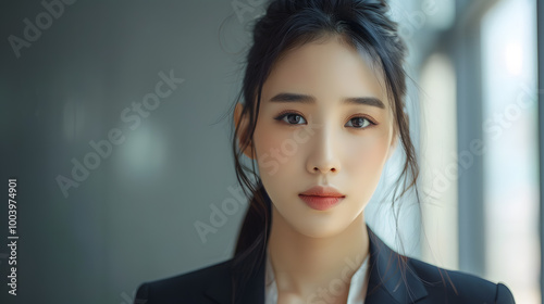 Beautiful Asian woman in a formal suit, businesswoman. Neural network AI generated art