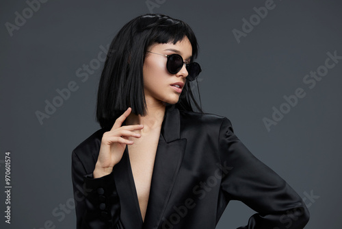 confident, asian, woman, black, suit, sunglasses, stylish, professional, elegant, glamourous, fashion, business, chic, modern, urban, powerful, female, adult, attractive, sophisticated, bold, cool, pose, portrait, sleek, graceful, trendy, grey, background, strong, model, authority, executive, posh, daring, sharp, formal, poised, fierce