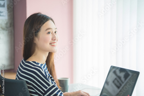 people, technology, computer, woman, cyberspace, laptop, notebook, happy, young, using, home, girl, beautiful, work, female, lifestyle, sitting, office, portrait, casual attire, adult, smile, business, wireless, screen, modern, person, room, pretty, attractive, smiling, job, indoor, asian, thai, korean, japanese, 20s, copy space