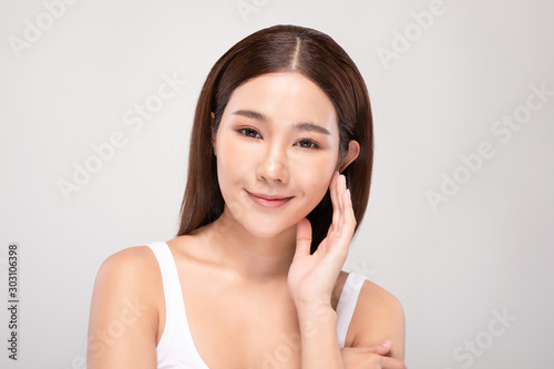 Beautiful Asian young woman touching soft cheek smile with clean and fresh skin Happiness and cheerful with positive emotional,isolated on white background,Beauty and Cosmetics Concept
