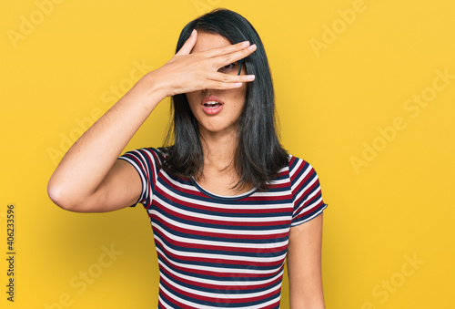 Beautiful asian young woman wearing casual clothes and glasses peeking in shock covering face and eyes with hand, looking through fingers with embarrassed expression.