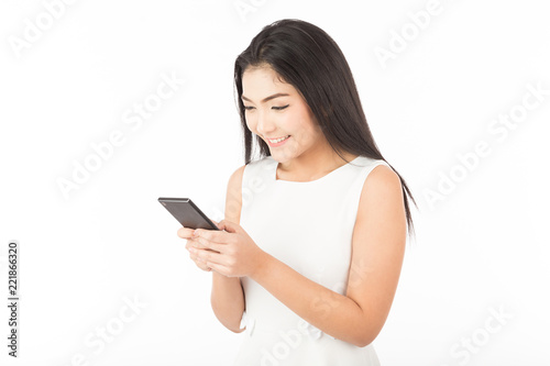 Beautiful Attractive Asian young woman using smartphone smile and happiness,Isolated on white background